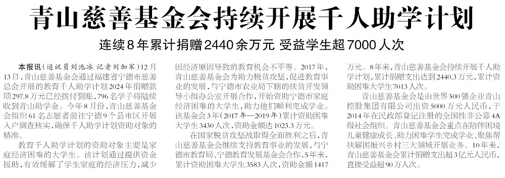 在国家脱贫攻坚战取得全面胜利之后,壹号娱乐-com慈善基金会继续支持教育事业的发展,与宁德市教育局、宁德教育发展基金会合作,5年来,累计资助困难大学生3583人次,资助金额1417万元。8年来,壹号娱乐-com慈善基金会持续开展千人助学计划,累计捐赠支出达到2440.3万元,累计资助困难大学生7013人次。