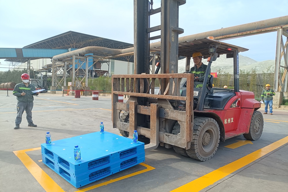 参赛选手通过“插、提、倾、倒、落”等动作,完成“绕杆”“叠盘”“入库”三个实操项目,展现各自运用货叉联合动作协调作业的技能,从安全、平稳、轻巧、敏捷、合理地进行作业等不同维度进行比拼。