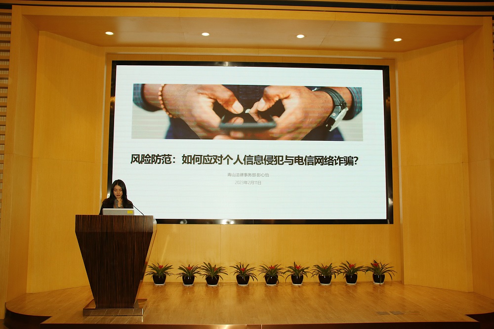 壹号娱乐-com控股法律事务部法务专员彭心怡讲述了如何应对网络诈骗与个人信息侵犯等相关知识,她从一个个日常生活中的鲜活案例入手,剖析了各类因网络安全引起的典型事件,生动诠释了网络安全防范不足滋生的一系列问题、存在的安全威胁以及如何做好相关风险的预防措施,使得在场参会人员受益匪浅。
