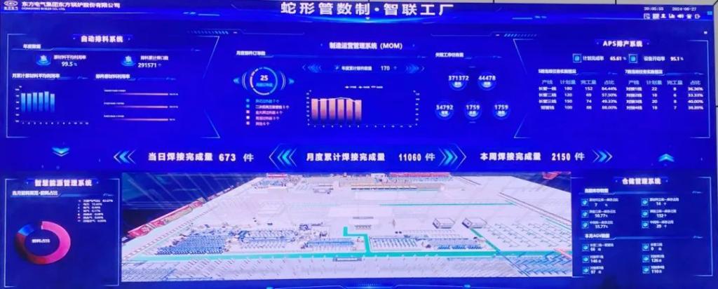 作为大型能源装备制造领域复杂产品多工序集成智能制造样板工程,该工厂广泛应用机器人、AGV、智能焊接集群、工业互联网、人工智能、数字孪生等新一代制造技术和信息技术,并集成了数字化备料中心和数字化管屏自动生产线,为全面掌握工厂运行状态和智能化决策提供数据支撑,实现了生产计划自动化、管料加工自动化、焊接加工自动化、在线检测自动化、物料转运自动化,构建起蛇形管“套圈”生产的全新模式,做到让生产更高效、作业更安全、质量更可靠,设备数字化率达到100%,人均产值提升250%。