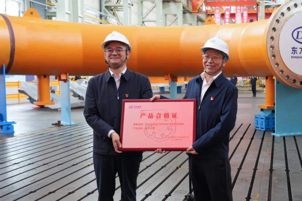 双方代表移交了大唐扎拉水电站国产化首台500兆瓦冲击式机组配水环管合格证。