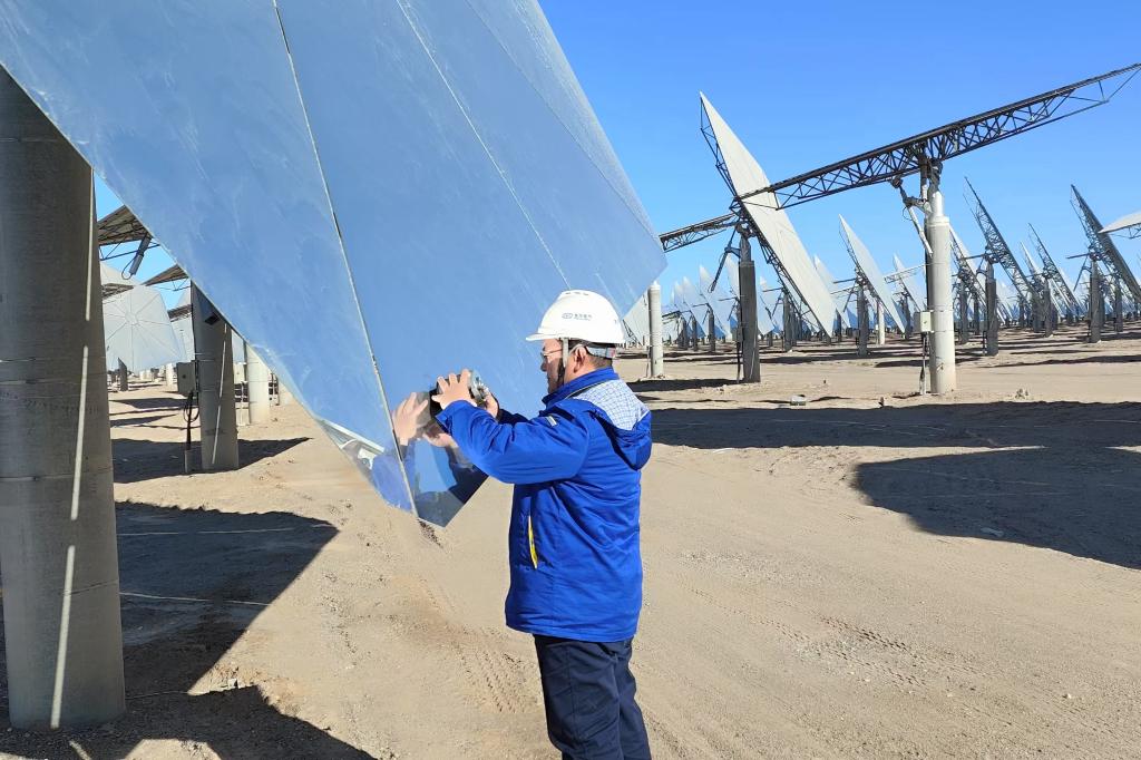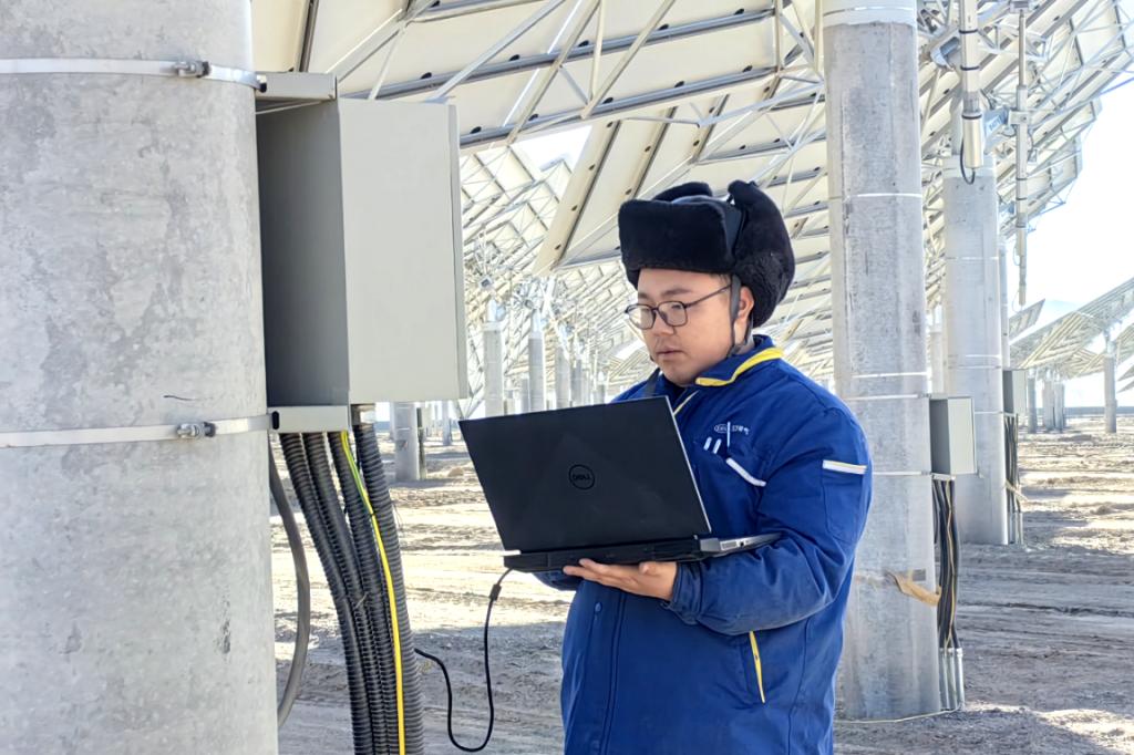 在甘肃阿克塞汇东新能“光热+光伏”项目现场,零下10度的环境下,pa旗舰厅官网锅炉项目团队成员林雪松在进行定日镜清洁度抽查工作,以确保定日镜聚光反射太阳能的精确性能;pa旗舰厅官网自控王强开展镜场LOC箱设备调试工作,为聚光集热做准备。