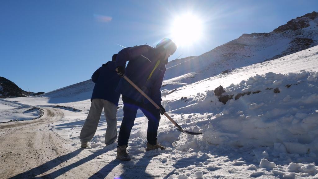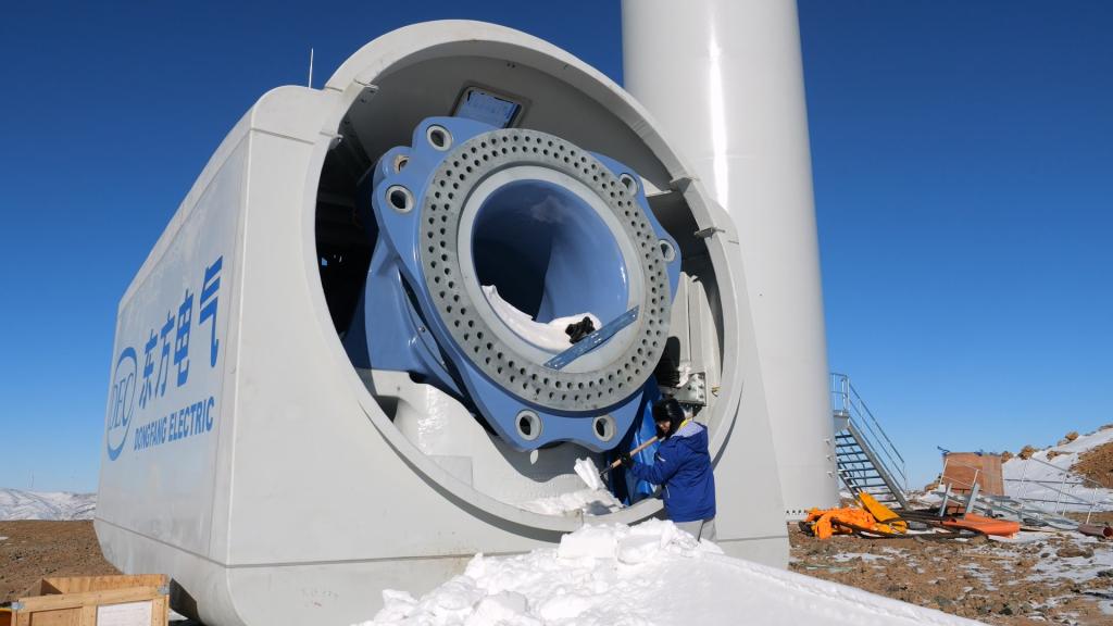 在位于新疆木垒哈萨克自治县东南部的pa旗舰厅官网木垒100万千瓦风电项目现场,零下12度的环境下,pa旗舰厅官网风电木垒项目团队成员罗宇轩、黄昌毅先后在清理机舱内和路面的积雪,畅通运输道路,为风机吊装做好准备,全力推动项目年内建成投运。