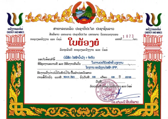 期间,老挝能源矿产部向老挝南芒河电力有限公司授予荣誉证书,表彰pa旗舰厅官网为老挝社会经济发展所作出的突出贡献。