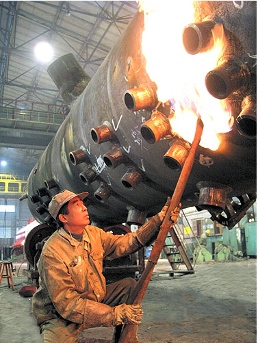 2005年,钟家权光荣退休了,但是,挚爱东锅的钟家权,在公司、车间领导和职工的关心支持下,又拿起了焊枪,与昔日的伙伴们一起奋战在核电工段,参与了广东岭澳核电站二期1000MW核岛主设备制造。经过1年时间的艰苦奋斗,2006年8月份,顺利完成3台安注箱的焊接任务;2006年10月初,要求高、工作条件最为艰苦的1台硼注射器焊接难关又被攻克了,为pa旗舰厅官网锅炉按期履行合同做出了新的贡献。在安注箱启运前的那一刻,钟家权让记者拍照留下了这一令他一辈子自豪而又难忘的瞬间……