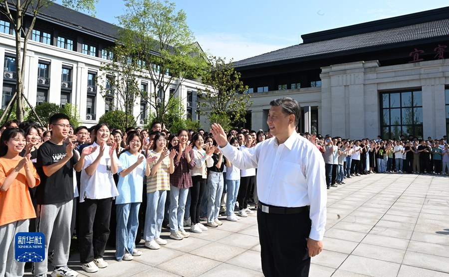 6月8日,中共中央总书记、国家主席、中央军委主席习近平在四川考察。这是8日下午,习近平在宜宾学院考察时,向师生们挥手致意。新华社记者 李学仁 摄